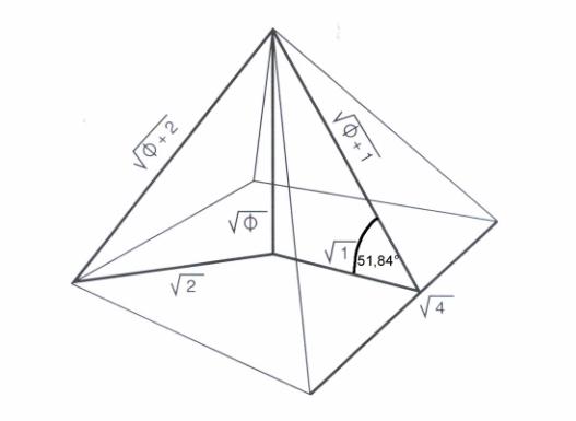 I 4 lati triangolari di questa piramide hanno una angolazione di esattamente 51,84° rispetto alla base. Se si misura la distanza fra la punta della piramide e il centro di un lato della base quadrata, si nota che questa distanza è esattamente 1,618034... volte la distanza fra il centro della piramide e il centro di un lato. Quindi la geometria della piramide di Cheope si basa –oltre su PI Greco- sostanzialmente sul numero d’oro ottenendo lo stesso angolo, sotto il quale si deve tagliare il cono iperbolico per ottenere un uovo con le proporzioni d’oro. Visto, che insieme alla sezione aurea appare sempre l’angolo di  51,84°, sarebbe opportuno di chiamarlo angolo aureo.