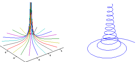 Facendo ruotare la curva iperbolica intorno l’asse Y, si ottiene una figura tridimensionale: Il cono iperbolico (rapp.). In una rappresentazione con coordinati polari, si ottiene una spirale tridimensionale, che gira intorno il cono iperbolico (rapp. a destra)
