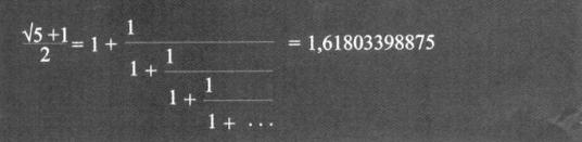 Quindi sottraendo il numero 1 da 1,618 si ottiene il suo valore per inverso, aggiungendo il numero 1 a 1,618, si ottiene il suo quadrato. Inoltre il numero d’oro Ф è rappresentabile –come tutti numeri irrazionali- da una frazione a catena. La frazione a catena del numero d’oro si basa esclusivamente fino all’infinito sul numero 1:
